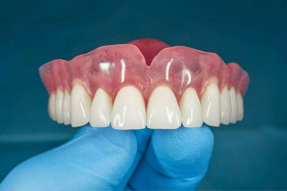 > Grâce à une empreinte réalisée au cabinet, le prothésiste réalise une plaque en résine rose dans laquelle sont intégrées des dents artificielles en résine ou en céramique.